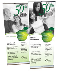 Messages for HPV & Cervical Cancer, ColonCancerCheck, Breast Screening are the focus of this series. This is also available in a single banner with combined messaging. A Prevention banner rounds out the series. These banners are designed to fit the popular ParaPost series of banner stands. Posters are easily interchangable. Banners are printed on 12ml Durasol with a 5ml emerytex laminate for extended durability.