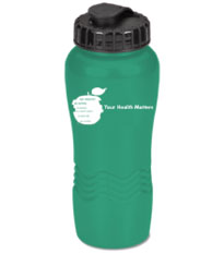 A wavy contoured design flows across the lower half of the bottle for visual appeal and a better grip. Track water intake with the 12, 18 and 24-oz markings on the side of the bottle. Black plastic twist-on lid features a snap closure over the mouthpiece for spill protection. This bottle is made with BPA-free PETE plastic, which is recyclable under symbol #1. Size: holds 26-oz.