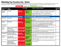 Tracking Card: $0.65 each (English or French) Full colour, 2 sided on 100lb gloss. Finished size is 8.5”w x 11” h. The Tracking Your Personal Cancer Prevention Card is pan-Canadian. Due to variations in provincial screening criteria, the Maintaining Your Preventive Care Card side of the card is available for each of the following provinces: |